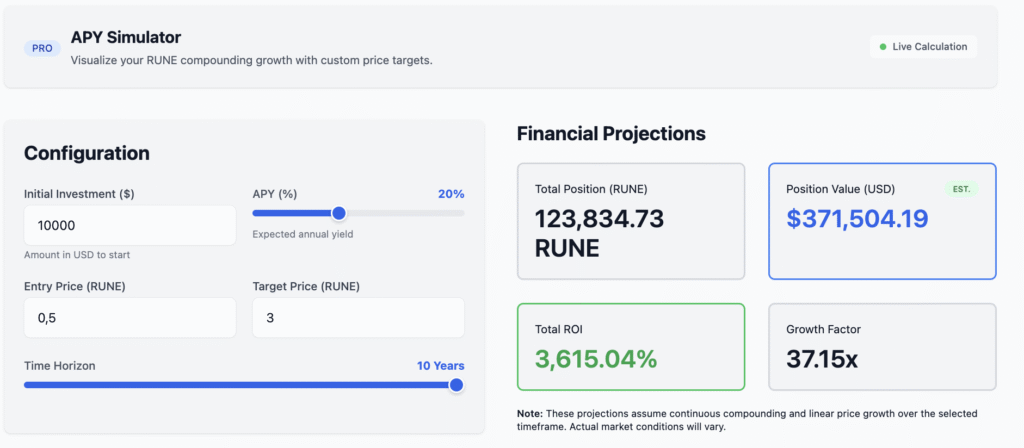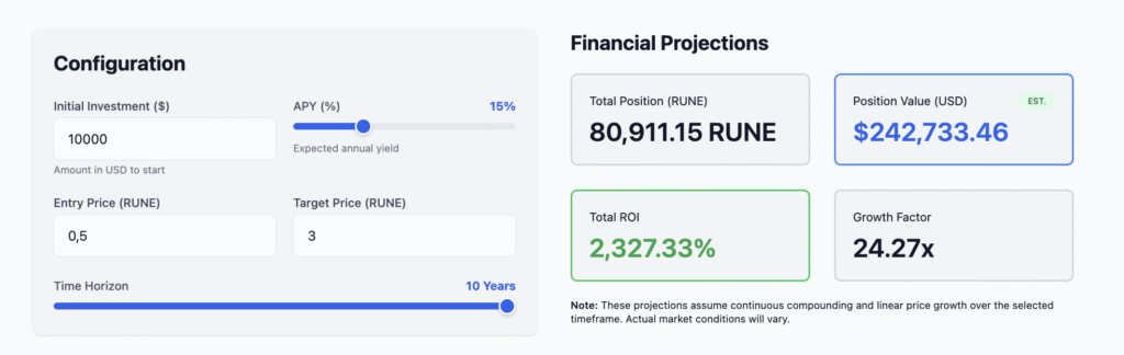 • 20,000 RUNE → 52,000–81,000 RUNE in 10 years (10–15% APY)